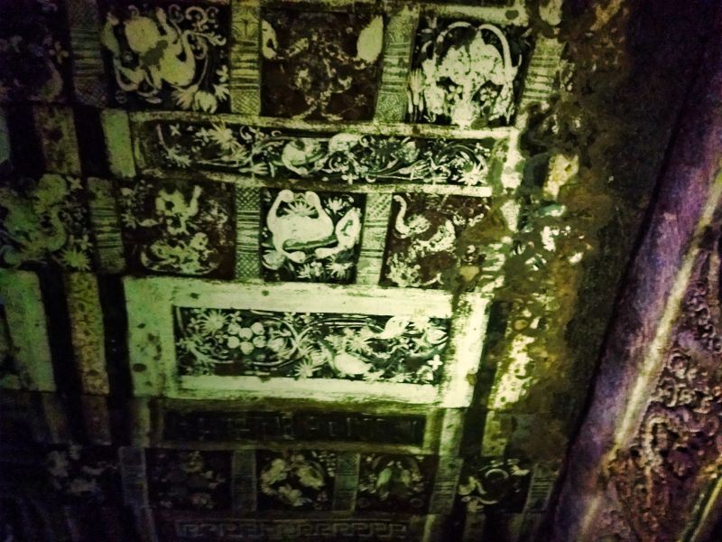 The ceiling is remarkable for paintings containing geometrical shapes, playful dwarfs and varied floral designs. The painters had set aside the Jataka tales for the walls. The ceiling decorations include a number of figures of Persian appearance, evident from their beards and clothes.