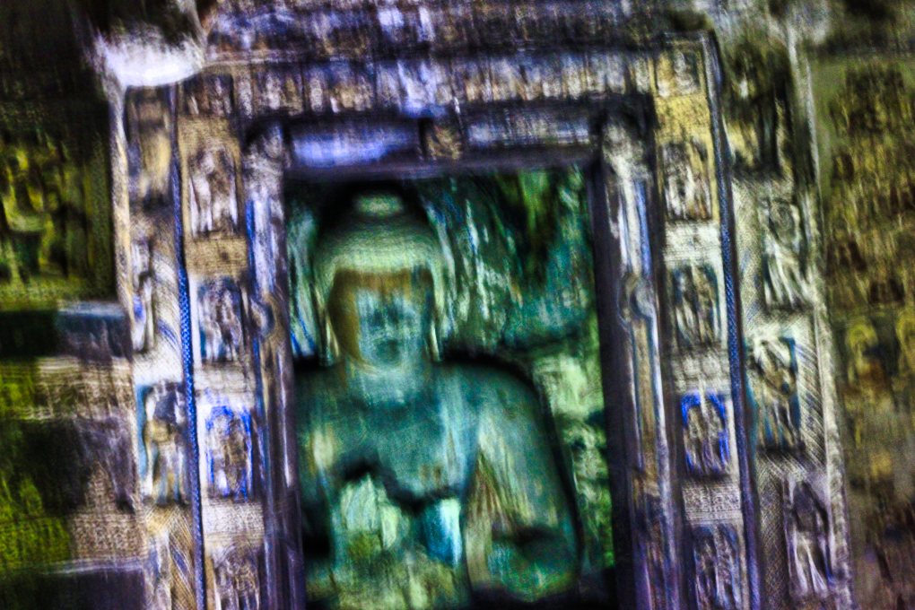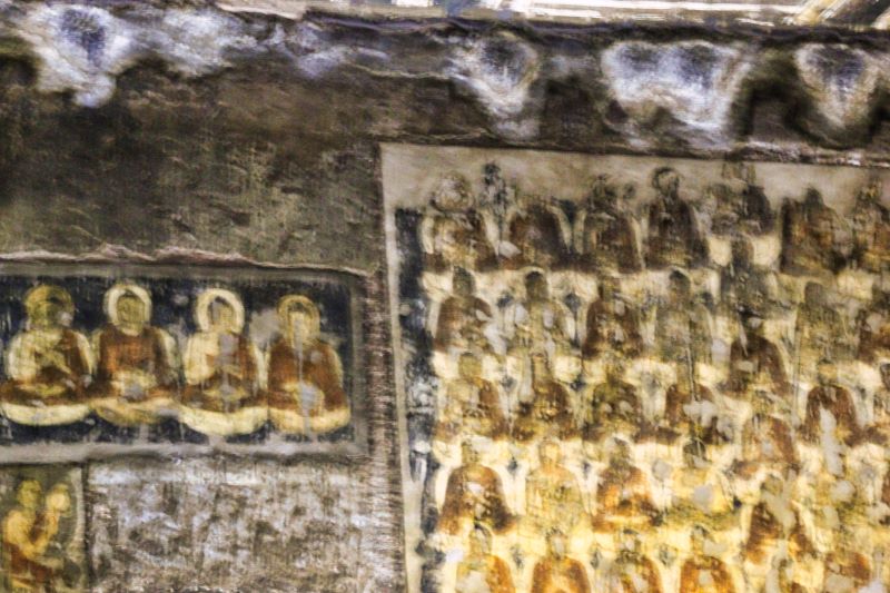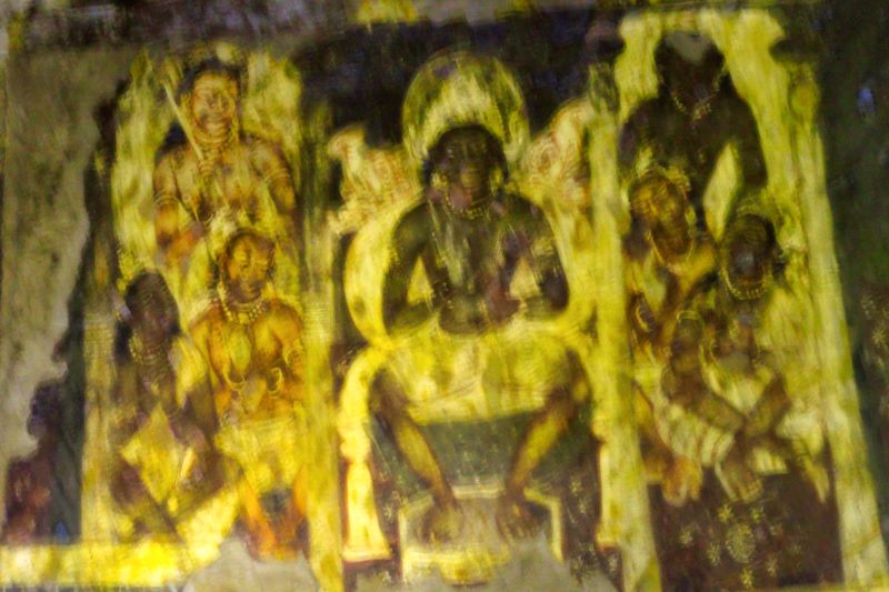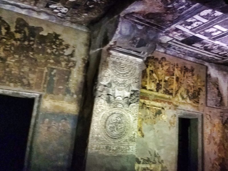 Ajanta Caves are excavated from a mountain of basalt rock in a remote location. There are 30 caves in a horse-shoe shaped curve. Ajanta Cave 2 is the second one that you will come across.