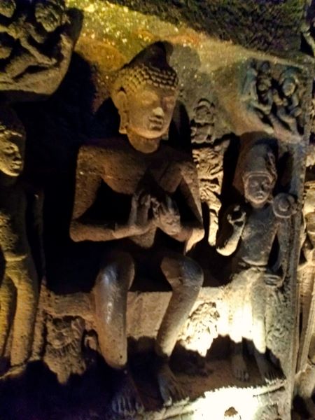 The wall on the right is full of sculptures. The lighting is dim with LED lights. The use of flash is prohibited. Hence photography inside the cave has its challenges.