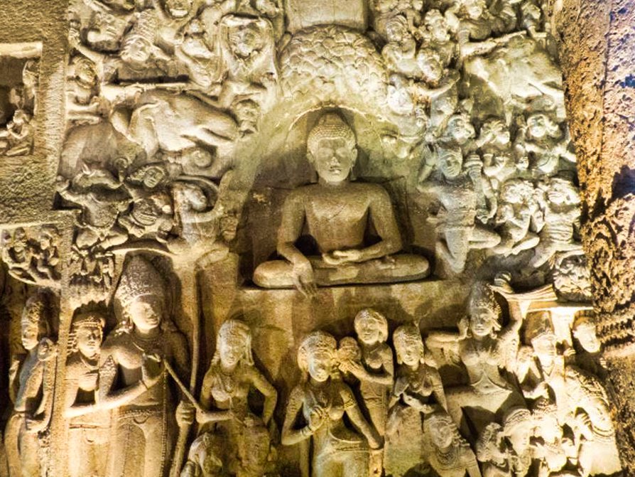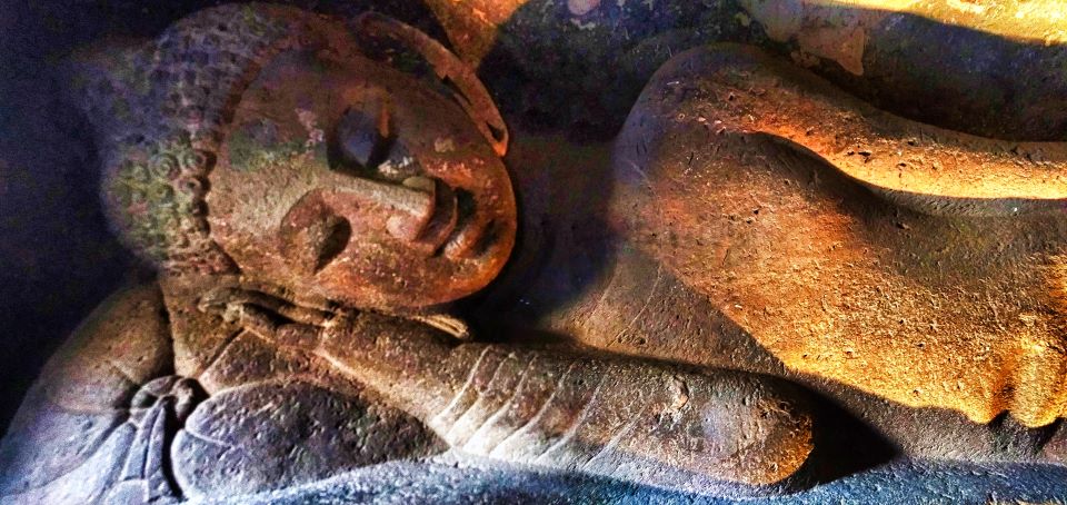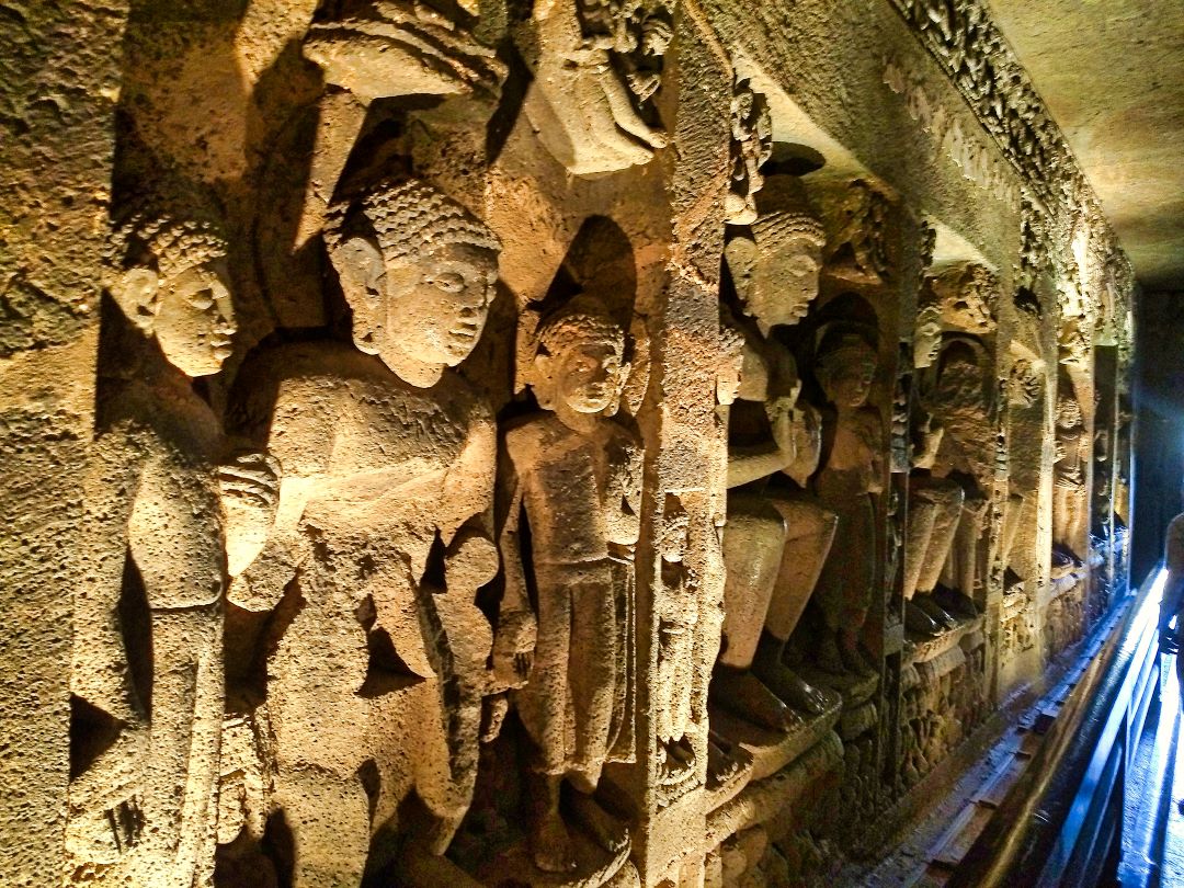 The wall on the left side near the entrance has a massive Buddha sculpture. Here Buddha is lying on his right side. The sculpture has a length of 7 metres. The panel below the sculpture shows Buddha’s disciples and celestial figures float above. This is one of the grandest and most sensitive depiction in all of Buddhist art. The Mahaparinirvana of the Buddha, when he achieved release from the mortal world, is a monumental sculpture.