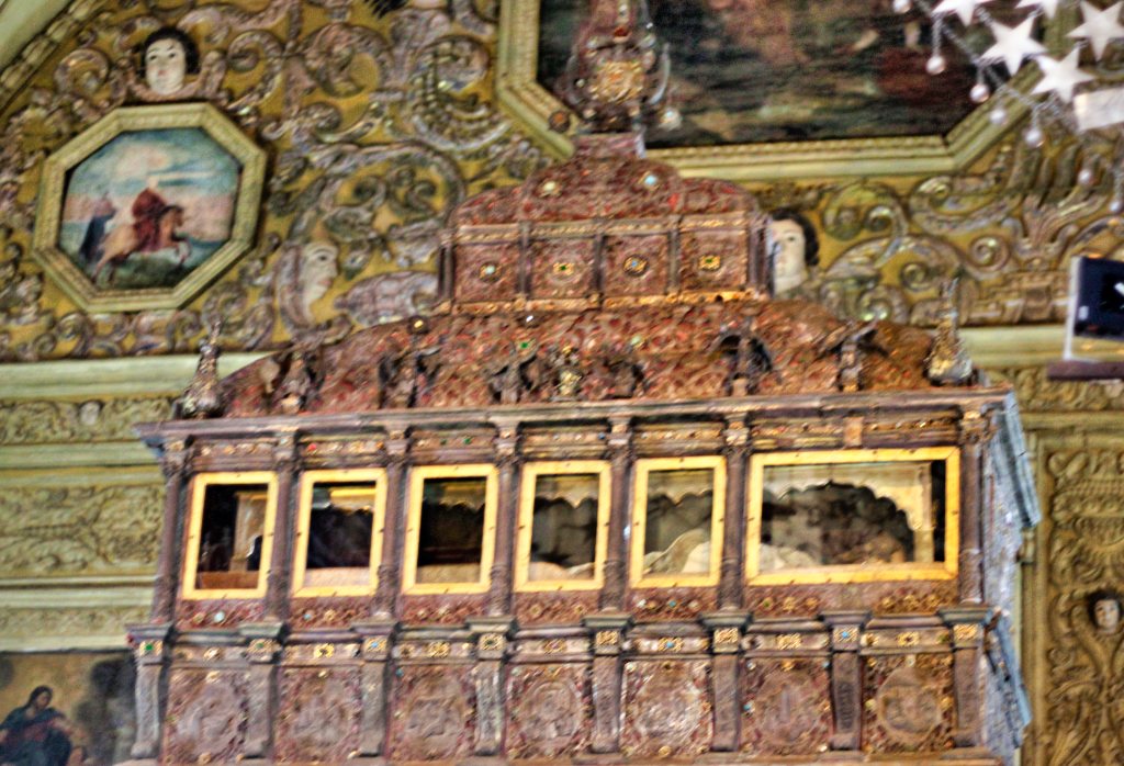 To the right of the main altar is the silver casket containing the the body of St Francis Xavier. The body was brought to the church in 1622 and installed in the mausoleum in 1698. Cosimo III, Grand Duke of Tuscany, commissioned Florentine sculptor Giovanni Batista Foggini to create the three-tiered mausoleum. Italian Jesuit Marcelo Mastrili designed the casket.