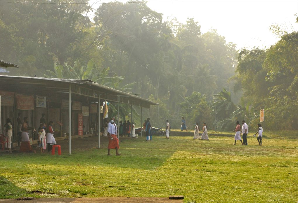 Devotees perform the rites early in the morning. They come down the steps from the temple towards River Periyar. Here it flows from west to east. On the banks of the river, sheds have been erected. Priests instruct the people in making bali tharpanam. After the ritual, believers float the ingredients down the river.