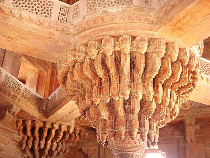The Lotus Throne is on top of a massive red sandstone column. Thirty six carved brackets support the throne. The emperor used to sit in the centre and his ministers on the four supporting structures.