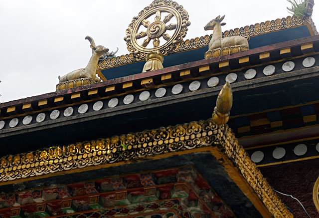 A nominal entry fee is payable. You walk along a narrow path for about 500 metres. At the end of the path, a covered wooden deck extends to the lake. Visitors have to take off shoes before entering the deck. We saw prayer wheels on both sides.
