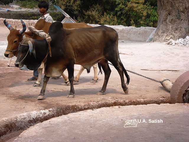 The bulls pull the grinding stone behind them and go around endlessly in circles. This age-old way of making lime mortar still continues in Mandu.