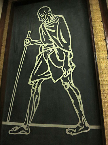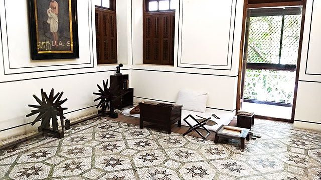 Gandhiji’s corner room is on the second floor. It is preserved in its original setting. Visitors are not allowed inside. But inside of the room is visible through the glass door. It is a spartan room with basic furniture which includes a bed, writing table and a couple of Chakras.