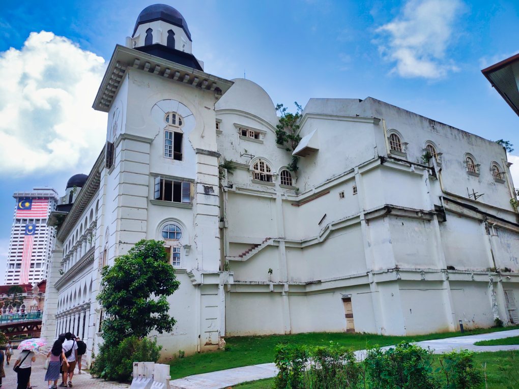 Behind the building stands the confluence of the Klang River and Gombak River. In the middle of where the two rivers meet stands the Jamek Mosque, a mosque designed in similar architectural style.