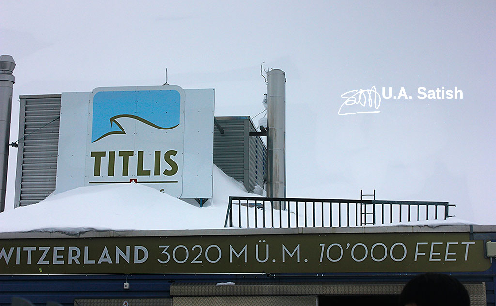 The temperature at the top was zero deg C. (It was 18 deg. C in Lucerne.) We were well protected with trekking shoes, thermals, jackets, gloves, caps and sun glasses. Luckily for us, it was mostly sunny and there was no rain. The summit of Titlis is above the snow line. It has a permanent snow cover and freezing temperatures.