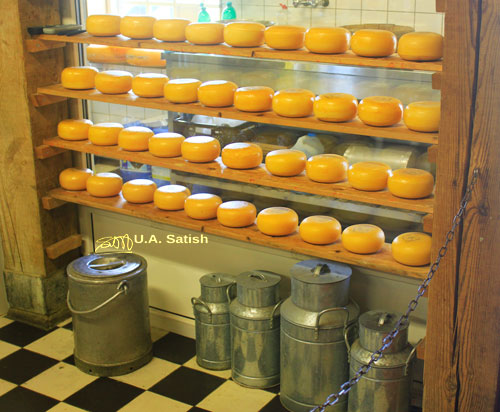 There are several shops spread along the village. They sell Dutch wooden clogs, memorablia, Delft Blue porcelain, ice creams, snacks and cheese. There is also an a-la-carte restaurant. After sampling many types of cheese, I bought smoked goat cheese and it was delicious. The goat cheese is made from goat milk. It is melted and smoked on beech wood in a smoke oven. This gives the smoked cheese its special flavour and edible brown crust.