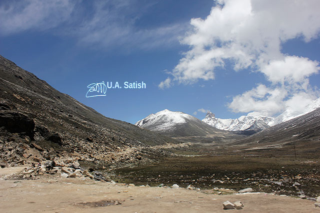 Zero Point is bordered by mountains. On the other side of the mountains lies People’s Republic of China (PRC). China spans five geographical time zones and borders 14 countries. The mountains are covered with snow during most of the year. We had gone there in June and plenty of the snow had melted.
